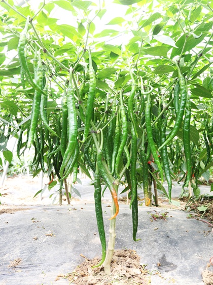 品種來(lái)源:JNF1×SRM1 特征特性:鮮食。雜交種,中晚熟,平均株高106.2厘米,平均株幅112.4厘米,全生育期168天,始收期67天;始花節位8~9節;平均果實(shí)縱徑25.6厘米,平均果實(shí)橫徑1.42厘米,平均肉厚0.26厘米;果實(shí)線(xiàn)形,青熟果綠色,老熟果紅色;平均單株結果數34個(gè),單果重37.3克。維生素C含量128.7毫克/100克,辣椒素含量0.23%。中抗病毒病CMV,感病毒病TMV,感疫病,中抗炭疽病,耐高溫,不耐高濕。第1生長(cháng)周期畝產(chǎn)2620千克,比對照華一1849增產(chǎn)3.1%;第2生長(cháng)周期畝產(chǎn)2400千克,比對照華一1849增產(chǎn)0.8%。