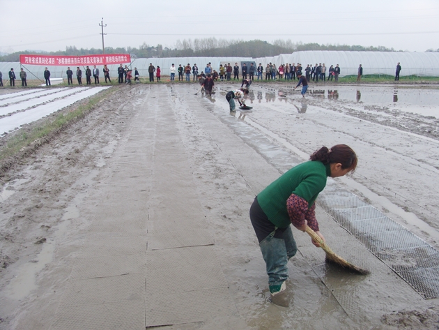2015年4月15日上午,河南省成果轉化項目“水稻拋植苗原床泥質(zhì)露天育秧法”育秧現場(chǎng)觀(guān)摩會(huì )在浉河區東雙河鎮召開(kāi),我院水稻科研團隊成員、各縣區承擔項目轉化任務(wù)的負責同志及技術(shù)人員、示范基地負責人、農民代表70余人參加了此次觀(guān)摩會(huì )。