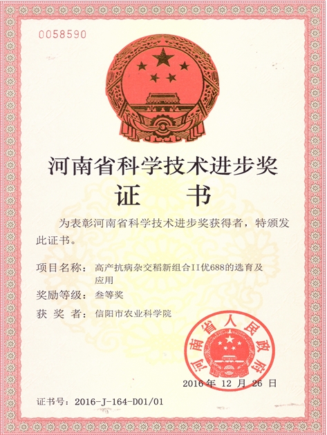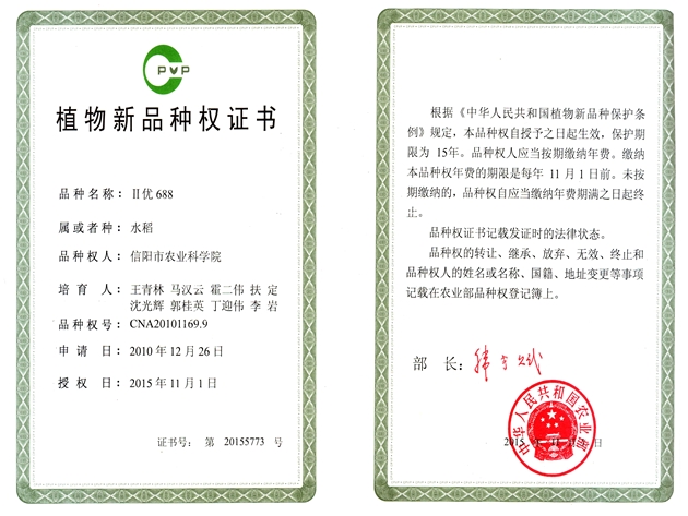 II優(yōu)688以不育系II-32A為母本,自育恢復系信恢688作父本測交組配而成,在河南省水稻品種中間試驗中平均畝產(chǎn)稻谷579.1公斤,比對照增產(chǎn)7.23%。2009年4月通過(guò)河南省品種審定委員會(huì )審定,2015年11月獲農業(yè)部植物新品種權證書(shū)。河南省農科院查新報告認為:Ⅱ優(yōu)688在近十年來(lái)河南省審定的50個(gè)中秈稻品種中,產(chǎn)量表現突出,并具有多抗、優(yōu)質(zhì)等特點(diǎn),具有廣闊的推廣應用前景。