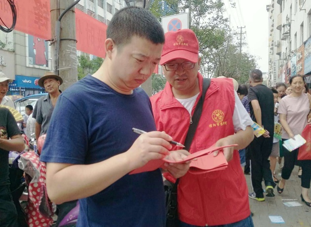 為了讓活動(dòng)更有針對性,7月5日下午,我院組織了14名志愿者,分成三個(gè)自愿小組,分別到勝利路小學(xué)、稻香村家屬區、寶石廣場(chǎng)等公共場(chǎng)所,隨機邀請市民參與“信陽(yáng)市民文明行為準則候選條款”征集活動(dòng),并同時(shí)向廣大市民宣傳創(chuàng )建全國文明城市的知識內容。