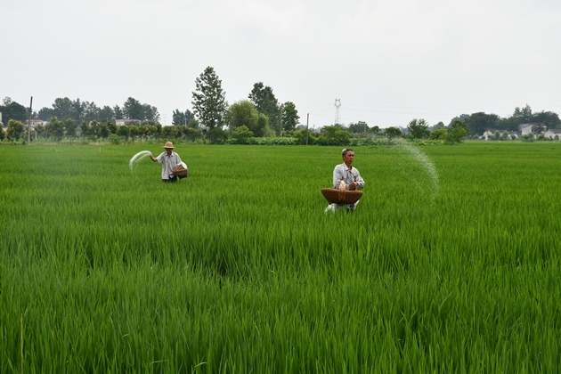 光山縣友誼農林專(zhuān)業(yè)合作社今年種植再生稻1000畝,由于播種和移栽均較早,旱情正嚴重時(shí),再生稻正處于曬田期而需水少,非常有利于控制群體和根系生長(cháng),有助于構建健康群體和提高成穗率,近期水分充足利于再生稻的孕穗。我院水稻專(zhuān)家豐大清副研究員來(lái)到該合作社指導再生稻穗肥撒施作業(yè),他介紹說(shuō),增施穗肥有利于穗粒數的增加和籽粒的飽滿(mǎn),并為再生季貯備養分,是提高頭季稻產(chǎn)量和提高再生能力的關(guān)鍵技術(shù)措施,但如果施用不當,容易造成稻稈基部徒長(cháng)、無(wú)效分蘗增多以及貪青晚熟等不利影響,可能會(huì )導致水稻株形惡化、群體質(zhì)量變差,病害增多及招致倒伏等。因此要根據生育進(jìn)程及田間長(cháng)勢確定施肥時(shí)機,均衡施肥。