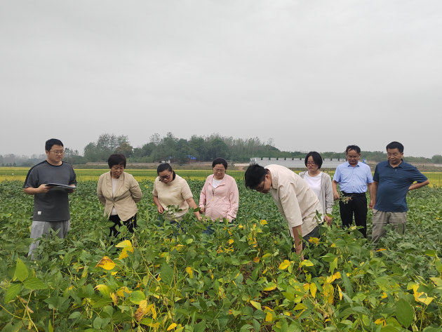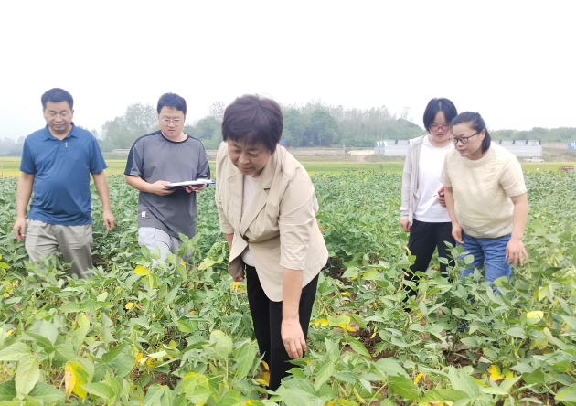 在我院油料所所長(cháng)、大豆課題組組長(cháng)金開(kāi)美、課題組張晶鵬等團隊成員的陪同下,耿臻一行深入探訪(fǎng)了我院陸廟大豆試驗基地。她對試驗基地管理表示認可,并與現場(chǎng)科研人員就大豆生長(cháng)狀況、品種特性及試驗設計等方面進(jìn)行了深入探討。