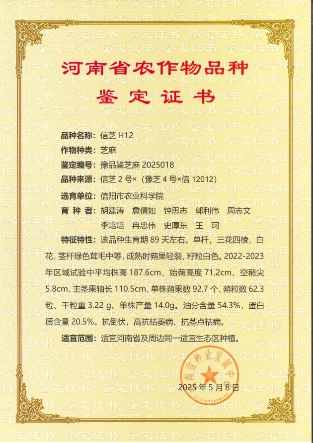 信芝H12(鑒定編號:豫品鑒芝麻2025018),2022-2023 年區域試驗中平均產(chǎn)量 98.08公斤/畝,生育期 89 天左右,株高187.6厘米,平均含油量55.31%,蛋白質(zhì)含量 20.5%,適宜在河南省及周邊同一適宜生態(tài)區種植。